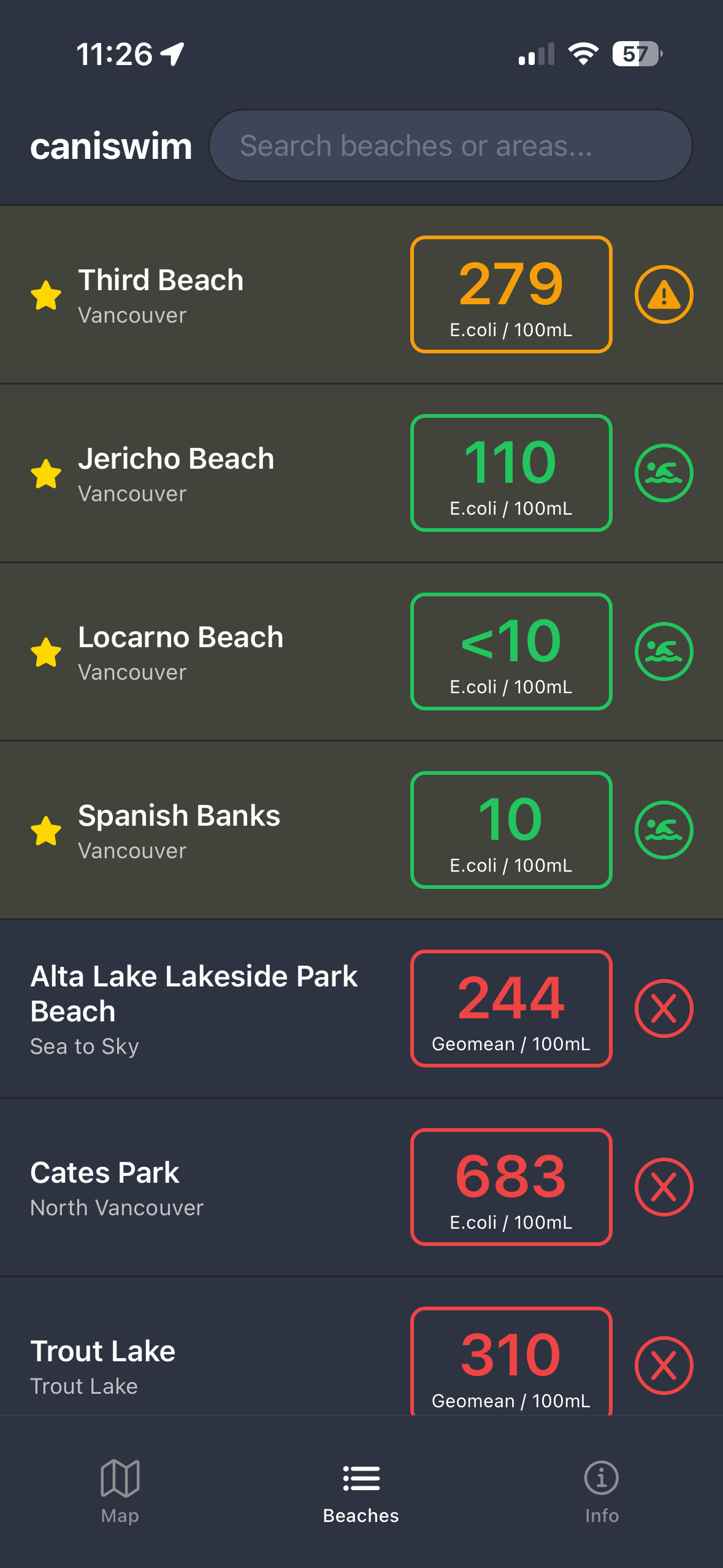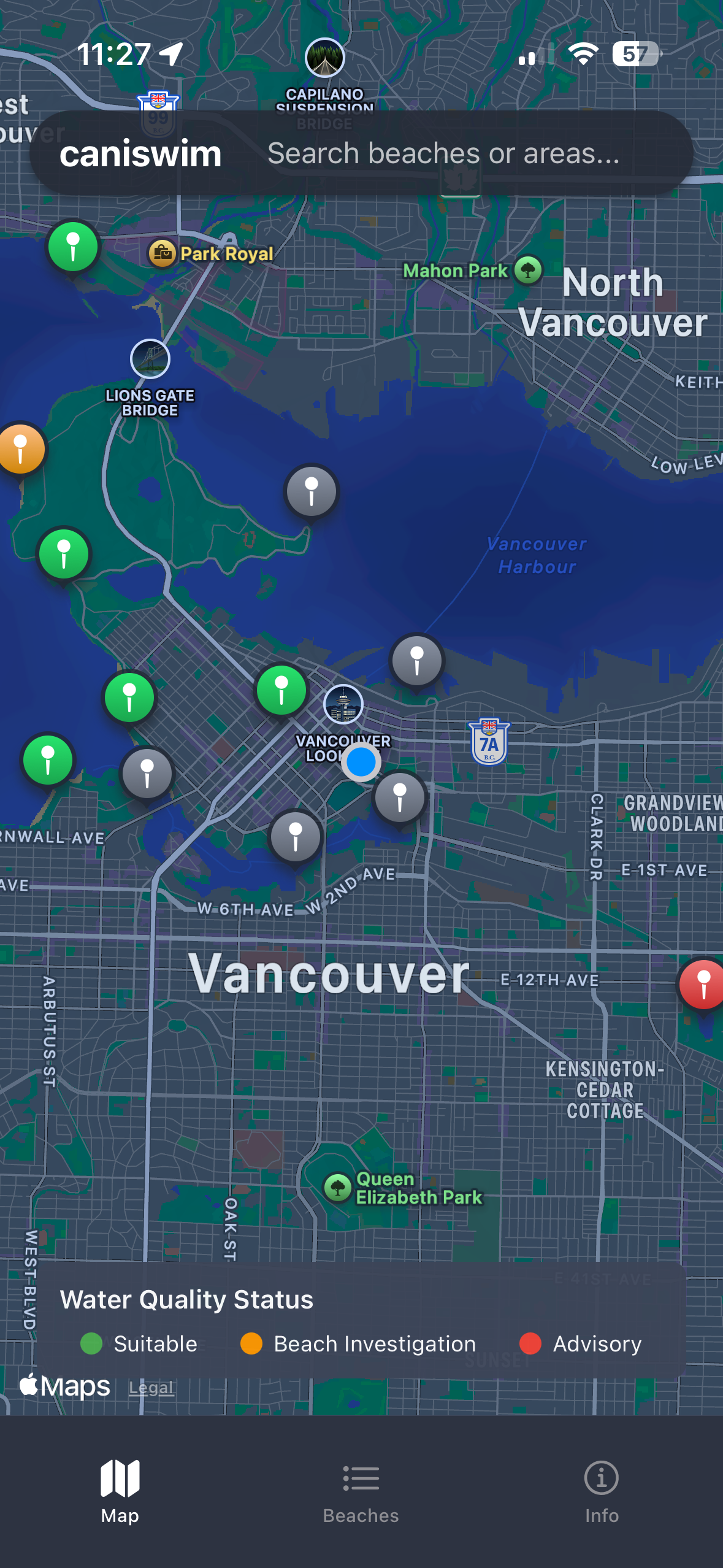 Caniswim shows the latest public beach water quality statuses published by Vancouver Coastal Health (VCH), presented in a fast, privacy‑friendly iOS app. Perfect for deciding when and where to swim.